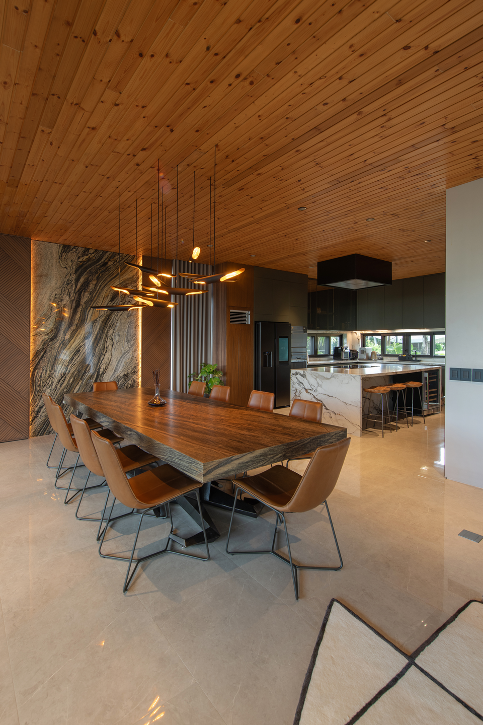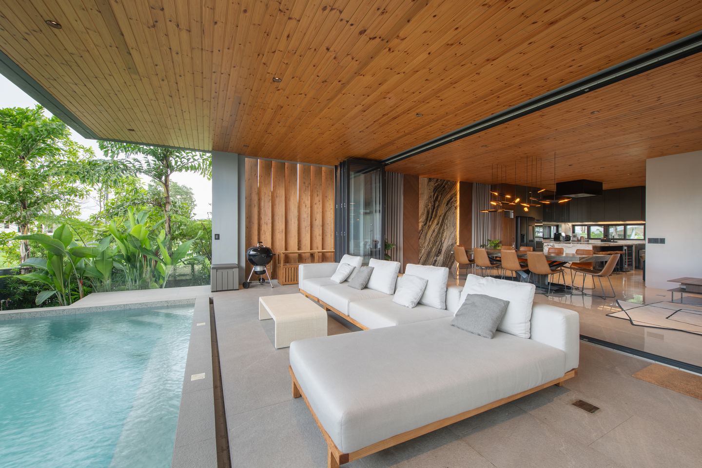 The layout prioritizes openness and connectivity, with floor-to-ceiling glass doors, a dramatic wooden ceiling, and fluid transitions across living, dining, and outdoor spaces. The result is an airy, light-filled interior that encourages togetherness and easy movement.