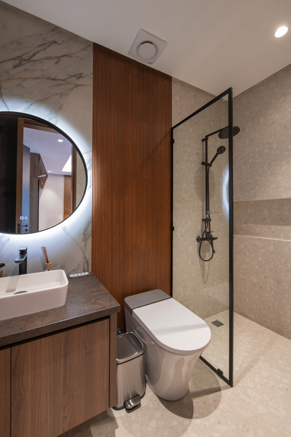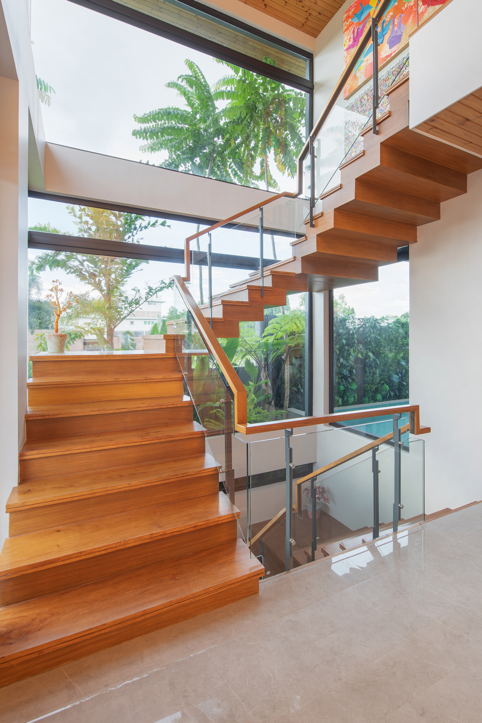 The design strikes a balance between natural elements like wood and stone, and clean, contemporary lines, creating a home that feels both warm and elegant. The palette and textures evoke a tropical ambiance while maintaining a modern aesthetic.