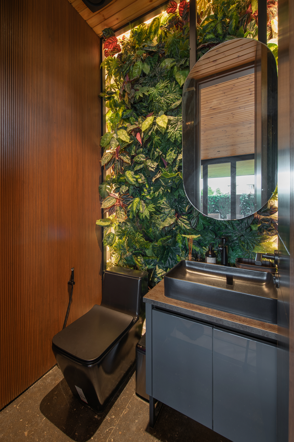 At the heart of the design is a deep appreciation for the outdoors. Bi-fold doors lead to a serene lanai and lap pool, surrounded by lush greenery and a vertical garden—bringing a resort-style ambiance into everyday life.