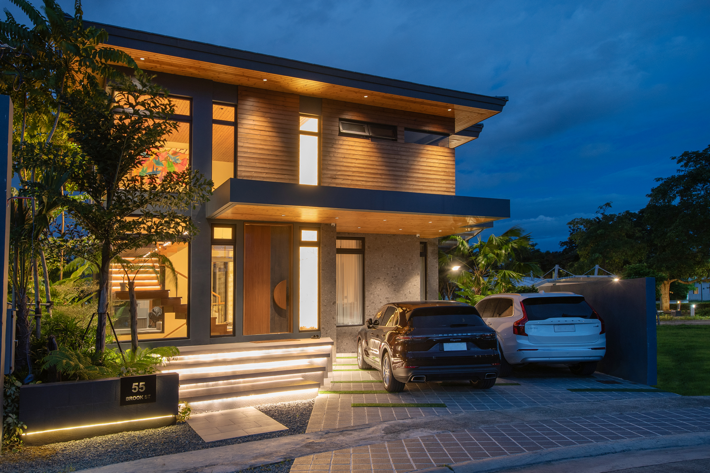 A defining feature of the home is its striking front elevation, enhanced by a floating staircase and a custom-designed front door. These elements are tastefully illuminated to provide a welcoming glow, offering visual appeal both day and night.
