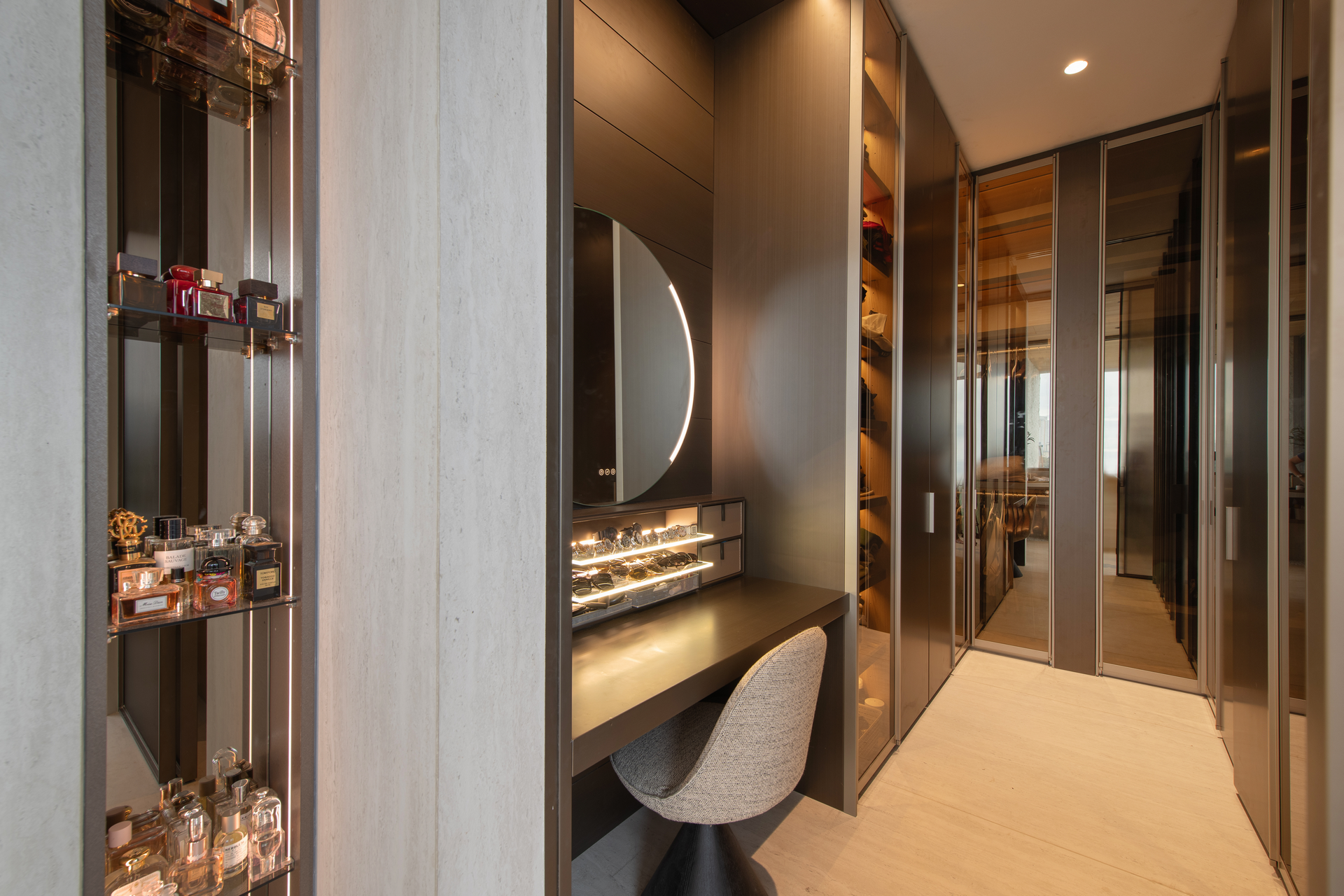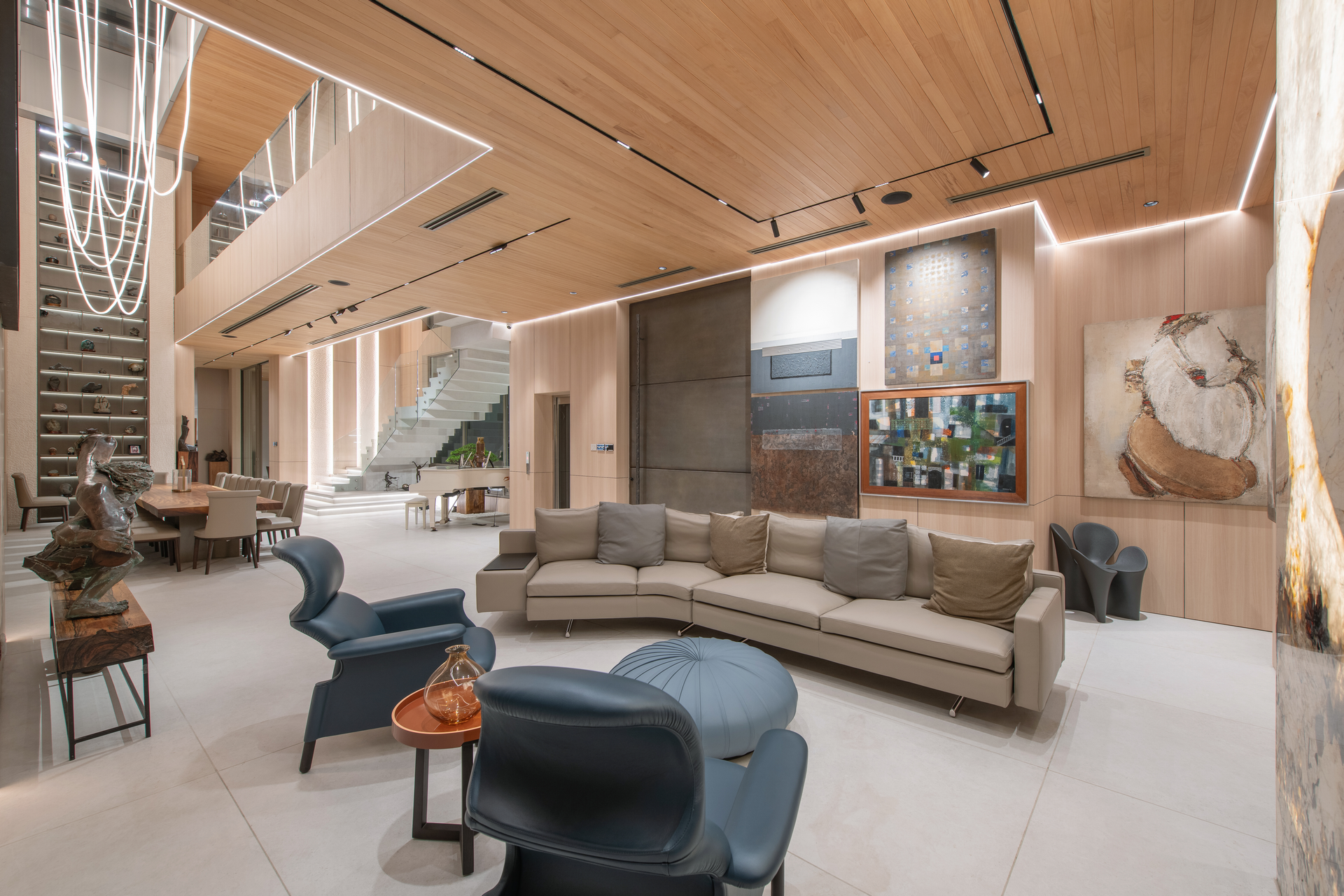 A whisky room adds a touch of sophistication, creating a retreat that invites relaxation and indulgence. A scenic elevator enhances the fluidity of movement between floors, while the exterior of the home, which appears to be only two stories from the street, belies the expansive space within. Softscaping, designed for the enjoyment of the family’s dogs, includes an open garden with a dedicated running area and a peaceful bonsai garden, where nature is woven into every corner of the property.